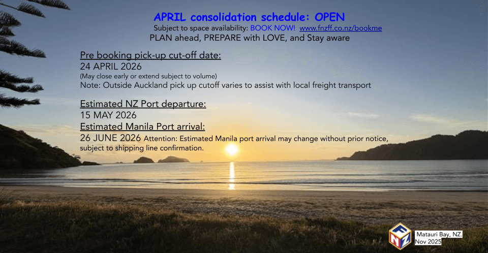 | Consolidation Month | Estimated Prebooking Cut-off date (May close early or extend subject to volume) | Estimated pickup Cut-off date (May close early or extend subject to volume) | Preloading window and processing of all boxes | Estimated Container arrival at Port of Loading | Estimated NZ Port Departure (May change without prior notice, subject to shipping line confirmation | Estimated Manila Port Arrival(May change without prior notice, subject to shipping line confirmation) Estimated sailing period NZ Port to MNL Port 35-45 days |